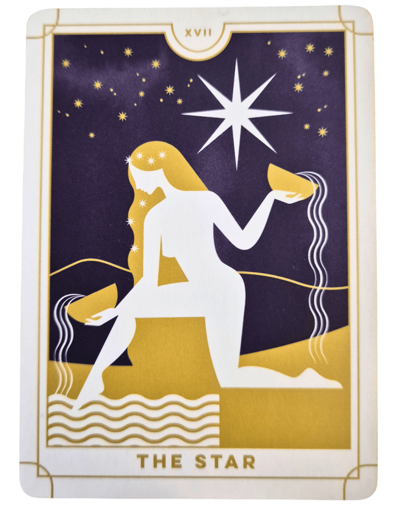 The Star shows a young woman kneeling beneath a wide, quiet sky, pouring from her cup back into the universe. It’s as if to say: “what you’ve been given is meant to be returned, offered, circulated, shared”. And that, to me, has always been Bodhi.